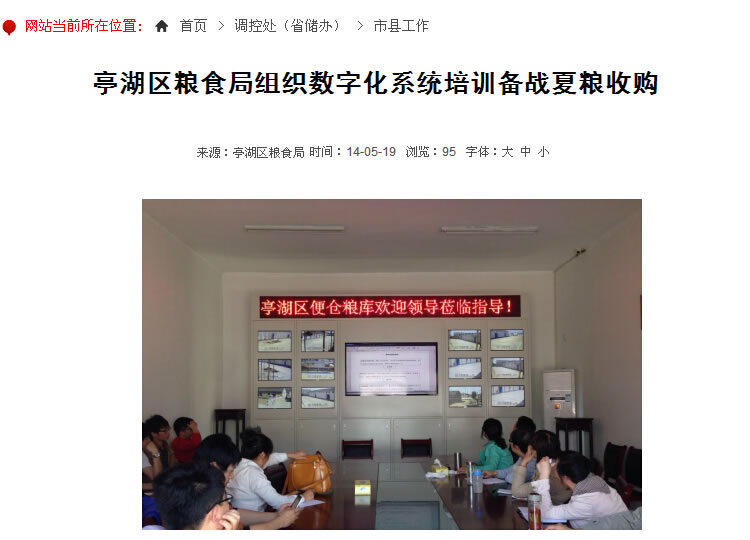 ? ? ?在2014年夏糧收購期間,亭湖區糧食購銷總公司便倉糧庫的“一卡通”糧食收儲信息化系統充分發揮作用,該庫日收購糧食最高紀錄被多次刷新,6月14日收購小麥1738噸,比歷史日收購最高值1352噸提高了近30%。截止6月25日該庫共收購2014年夏糧14379噸,其中收購最低收購價小麥11709噸。6月20日,市政府夏糧收購督查組組長、市委農辦周廣展副主任在督查指導亭湖區夏糧收購工作時給予了充分肯定。