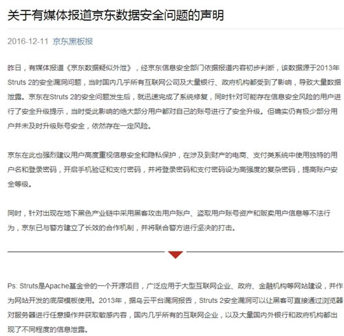 京東在12月11日凌晨發(fā)表聲明,稱該數(shù)據(jù)源于2013年Struts 2的安全漏洞,已經(jīng)完成修復。