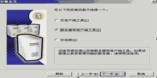 ?第5步:接下來的窗口是用戶名、公司名的自取,在經過軟件許可協議一步后,到達“安裝定義”對話窗口(如下圖)。同樣地,按其默認“服務器和客戶端工具”選擇到下一步