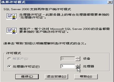 第10步:在“選擇許可模式”窗口,根據您購買的SQL SERVER2000軟件的類型和數量輸入?!懊靠蛻簟北硎就粫r間最多允許的連接數,“處理器許可證”表示該服務器最多能安裝多少個CPU。例如可選擇“每服務器1個處理器”。企業版和標準版時客戶許可設備數可以修改,個人版時0,您不能修改。
