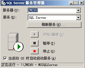 若該綠色圖標變成了紅色的方塊,則表明SQL Server已停止了服務,可通過“SQL Server服務管理器”程序來啟動SQL Server。雙擊該圖標,將出現以下的“SQL Server服務管理器”程序,可通過該程序停止、啟動SQL Server的后臺服務。