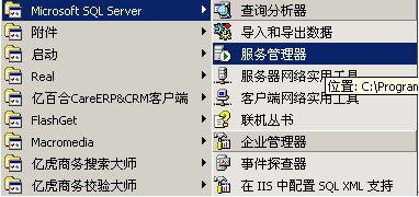 如果在計算機桌面右下角沒有出現的SQL Server服務監視圖標,依次單擊“開始”—“程序”,即可看到Microsoft SQL Server 2000的程序組件,如下圖